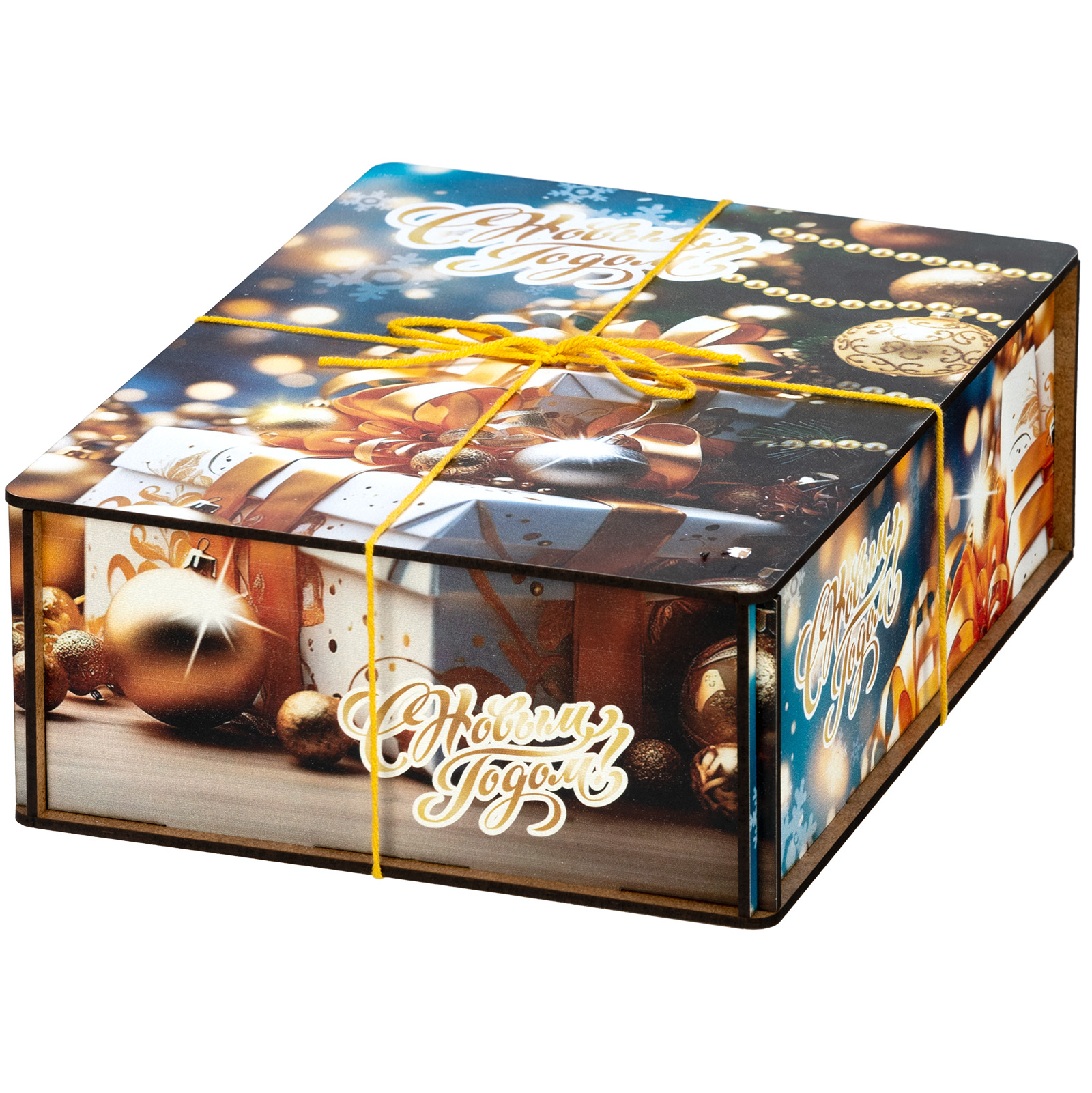 Универсальный подарочный набор, который придется по душе сластене абсолютно любого возраста. Подарочная упаковка выполнена в виде небольшого деревянного ящичка, перевязанного желтой веревочкой. Ящичек со всех сторон украшен яркими иллюстрациями с узнаваемыми новогодними символами: елочными шариками, гирляндами и подарками. Помимо привлекательной упаковки, этот набор может порадовать разнообразным наполнением - в его состав входят сладости на любой вкус - шоколадные конфеты с различными начинками, суфле, халва и многие другие вкусные лакомства, с которыми любое чаепитие станет настоящим праздничным торжеством!