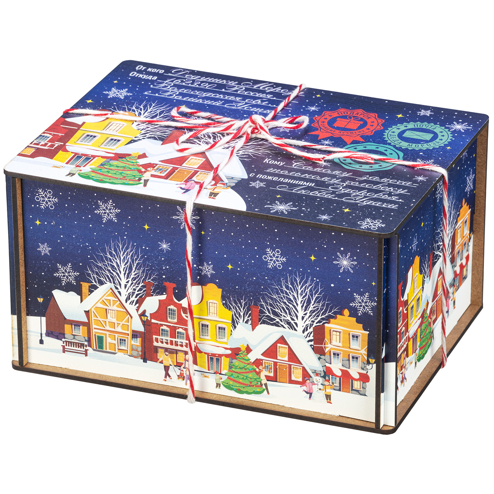 “Сияние ночи” - это новогодний сладкий подарок, который идеально в себе сочетает неповторимый вкус любимых сладостей и креативную оригинальную упаковку. Сладости бережно спрятаны в небольшой деревянный ящичек, украшенный со всех сторон разнообразными праздничными иллюстрациями в виде небольшого зимнего городка. Сверху упаковка закрыта удобной крышкой, оформленной в стиле посылки - посмотрите, даже фирменные печати есть! Внутри этого подарка находится килограмм разнообразных отборных сладостей и небольшой памятный сувенир. Такой подарочный набор универсален - его с легкостью можно вручить как взрослому, так и ребенку - восторг гарантирован в любом случае!