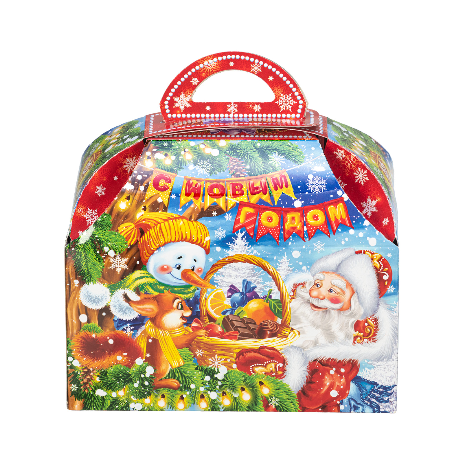 Подарите своим родным и близким безграничную радость вместе с новогодним сладким подарком “Сундук лакомств”. Этот подарочный набор представляет собой небольшую картонную коробочку в форме сундука с удобной ручкой сверху. На упаковке нанесен очень яркий привлекательный рисунок, на котором Дед Мороз и его друзья обмениваются подарками и веселыми улыбками. В состав подарка входит 900 грамм вкусных и разнообразных лакомств от ведущих кондитерских предприятий,  а также небольшой памятный сувенир в виде символа наступающего года.