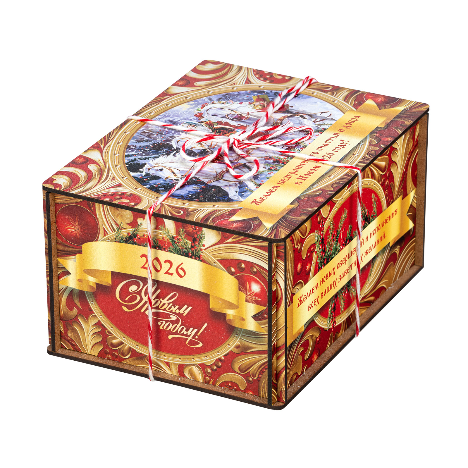 Ищете новогодний сладкий подарок подростку или взрослому? Присмотритесь к набору “Золотые узоры” - это оригинальный конфетный набор в яркой упаковке. В подарок входит килограмм вкусных и разнообразных кондитерских изделий от ведущих фабрик, а также небольшой памятный сувенир в виде символа наступающего 2026 года.  Сладости бережно упакованы в небольшой деревянный ящик, выполненный в сочетании золотого и красного цветов. На крышке есть небольшая иллюстрация с изображение Дедушки Мороза в упряжке белых грациозных лошадей. Упаковка аккуратно перетянута цветной ручкой шнурком, что еще больше добавляет ей привлекательности.